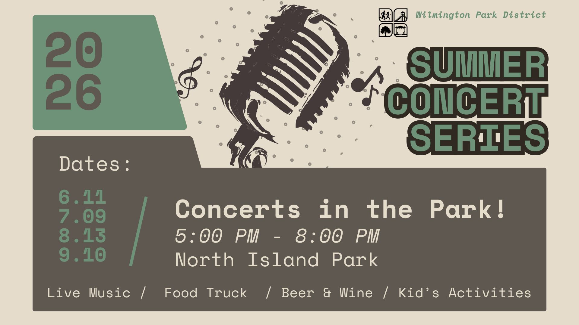 June–September Join the Wilmington Park District for their Summer Concert Series, happening on the 2nd Thursday of each month from June through September! Bring your lawn chairs, blankets, and the whole family for a relaxed evening of live music, great food, and summer fun.